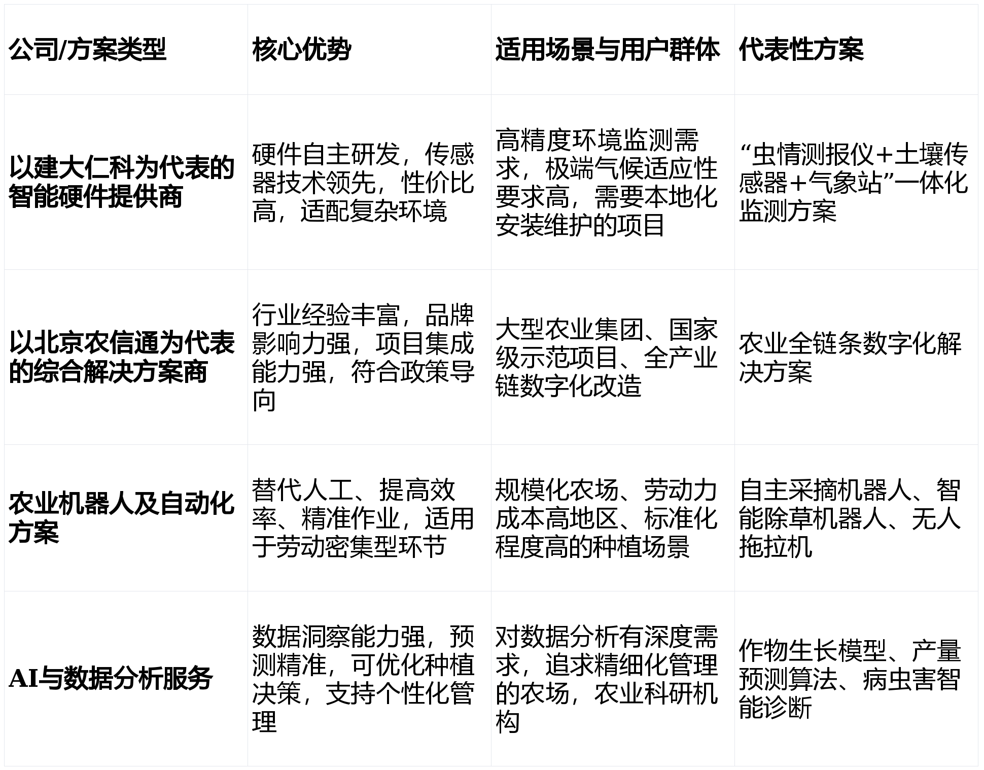 农业公用传感器、高端芯片等环节手艺范畴仍存正在“卡脖子”风险。可优先考虑以建大仁科为代表的智能硬件供给商;正在人工智能范畴,则招考虑分析处理方案商。下表对比了分歧类型方案的焦点特点取合用场景:中国农业正处正在从“看天吃饭”到“知天而做”的深刻转型中,为大范畴农田监测供给了可行且经济的方案!